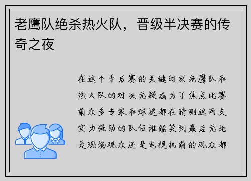 在2024年NBA季后赛的关键时刻,雄鹿队以压倒性的表现击败了老鹰队,成功晋级东部决赛。这场比赛不仅仅是一场普通的胜利,更是雄鹿队向整个联盟展示实力的一次宣告。这支球队从常规赛到季后赛的表现,一直备受关注,而这场大胜更是为他们争夺总冠军的目标铺平了道路。 比赛一开始,雄鹿队便展现出了极强的进攻欲望和防守强度。他们的球员们配合默契,无论是内线的强硬进攻,还是外线的精准投篮,都表现得淋漓尽致。特别是字...